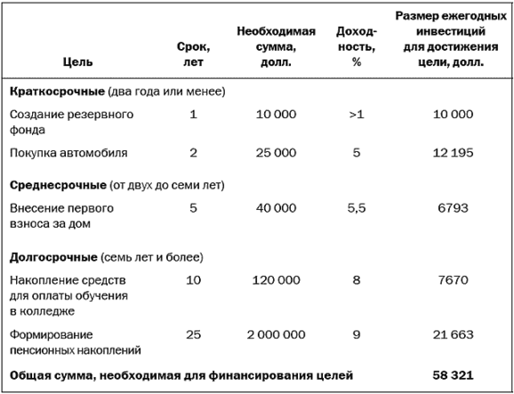 Чтобы ответить на эти вопросы, необходимо определить количество денег, которые вы должны будете направлять каждый год на финансирование ваших целей. При рассмотрении целей, перечисленных в табл. 1–5, становится понятно, что некоторые из них придется финансировать одновременно. Согласно условиям данного примера необходимо сэкономить 58 321 долл. в течение первого года, чтобы начать финансирование всех ваших целей. Срок инвестирования и риск. Виды инвестиций, которые вы выбираете, должны учитывать временны́е пределы ваших целей и допустимые уровни риска. Для достижения первых двух из перечисленных в табл. 1–5 целей отводится довольно мало времени, и соответствующие инвестиции должны быть направлены прежде всего на сохранение капитала. Например, неразумно вкладывать деньги, предназначенные для покупки автомобиля, в акции, поскольку риск потерять деньги на фондовом рынке в течение двухлетнего периода довольно высок.