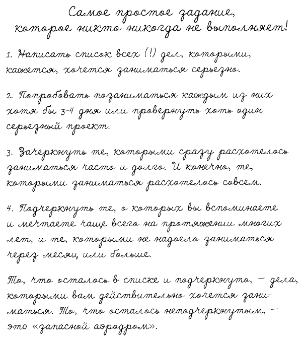 Выходит, у многих что‑то получается лучше, чем у других, просто потому, что они больше этим занимались. У них мелкая моторика лучше потому, что в пятилетнем возрасте им хотелось ровно вырезать какую‑то фигурку из бумаги и они попробовали это десять тысяч раз, пока не получилось. А может, они без устали нанизывали на нитку бусинки, желая сделать самые длинные бусы (или потому, что просто нравилось это занятие). Я рисовала лучше других детей в школе, потому что мне хотелось этим заниматься все свободное время. Трудно описать количество бумаги, вынесенное мной на помойку в процессе. Но эти горы испорченных рисунков никто не видел. Все видели только результат: что после всех тренировок я садилась и лучше всех выполняла задание «срисовать с картинки герб». Из чего все сделали вывод: «Видимо, у нее талант!» Талант – это способность заниматься чем‑то достаточно усердно и долго для получения выдающегося результата. Мы занимаемся делом с таким рвением, если нам очень нравится процесс и совершенствование в определенных навыках доставляет удовольствие. Если результат настолько окрыляет нас, что мы временами не замечаем, сколько раз пробовали, пока не получилось. У нас нет времени, чтобы расстраиваться по поводу неудач. Упав, спортсмен немедленно встает и пробует еще, с мыслью: а если в следующий раз сделать иначе? Должно получиться лучше. И очень хочется попробовать немедленно! И делает еще один круг, плюнув на боль и синяки. Когда процесс обучения выглядит так, человек порой не замечает, как проходят дни и недели, – он видит только ближайшую цель, и остальное его мало интересует. При таком подходе он будет более успешен в этом деле, чем остальные, у которых боль от синяка сильнее, чем желание прыгнуть как надо. Как же выявить свой талант к какому‑то делу? Я знаю только один рецепт. Чтобы втянуться в какое‑то дело и не суметь оторваться, нужно начать делать. Пока мы смотрим, как это делают другие, мы ничего не знаем о том, какие ощущения это занятие вызовет лично у нас. Каждый человек устроен иначе, каждый может пережить свое собственное разочарование или наоборот – очарование. Рассказы о каком‑то занятии, фильмы, фотографии, наблюдение за мастерами могут пробудить какие‑то чувства. Навести на мысли «так я хочу уметь» или «этим я хочу заниматься». Но окончательное решение можно принять, только когда все ощущения, связанные с процессом, мы пережили сами! Во многих странах существует производственная практика для детей и подростков. Их водят на предприятия и в разные компании, чтобы они посмотрели, как там все работает. Начиная с определенного возраста даже дают поработать над простыми заданиями в надежде на то, что у кого‑то загорятся глаза и он поймет, что хочет узнать все тонкости процесса и делать более сложные вещи. Также в Европе во многих вузах не допускают к вступительным экзаменам, пока претенденты не пройдут производственную практику, связанную с будущей профессией. Дело в том, что иной раз можно разочароваться в профессии мечты, если попробовать в ней поработать! Я часто слышала: «Я очень хотела быть воспитательницей, пока неделю не поработала в детском садике. После этого сразу поняла, что это совсем не мое!» Это то самое – собственное – ощущение от работы, которое никто нам не сможет описать. Только в процессе выясняется, наскольк