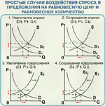 В простых случаях меняется или спрос, или предложение, в сложных случаях спрос и предложение изменяются одновременно. К более сложным случаям относятся следующие: 1. Предложение растет, спрос сокращается. При этом происходит снижение равновесной цены. Изменение равновесного количества может быть со знаком "+", "-" или "0". Все зависит от количественного соотношения изменений спроса и предложения. 2. Предложение сокращается, спрос растет. Здесь наблюдается повышение равновесной цены тоже за счет изменения и спроса, и предложения. Изменение равновесного количества может быть различным, как и в 1-м случае, оно зависит от соотношения изменений спроса и предложения. 3. Предложение и спрос растут. В этом случае на равновесную цену воздействуют две противоположные тенденции: