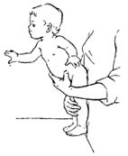 Повторить 4-6 раз. 10. Ребёнок стоит на столе спиной к матери, которая придерживает его за колени и живот. Перед ребёнком на столе ставят интересную для него игрушку. Малыш наклоняется, берёт игрушку и выпрямляет туловище. Повторить 2-3 раза. 11. Ходьба при поддержке за палочку или руку инструктора или матери. Продолжительность 20-30 секунд.
