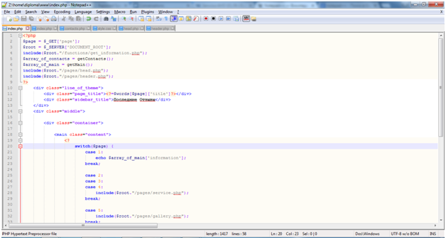 Для написания и редактирования программного кода я использовал текстовый редактор Notepad++. В отличие от громоздких средств разработки приложений, он не занимается много памяти на жёстком диске, не нагружает процессор и оперативную память и лёгок в обращении. Notepad++ на протяжении нескольких лет является одной из самых востребованных и используемых программ для редактирования HTML и PHP кода. Стоит заметить, что его возможности гораздо шире. Notepad++ — свободный текстовый редактор с открытым исходным кодом с подстветкой синтаксиса большого количества языков программирования и разметки. Поддерживает открытие более 100 форматов. Базируется на компоненте Scintilla, написан на C++ с использованием STL, а также Windows API и распространяется под лицензией GNU General Public License. Базовая функциональность программы может быть расширена как за счёт плагинов, так и сторонних модулей, таких как компиляторы и препроцессоры.