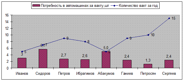 Нестандартную диаграмму построил в том же порядке, в каком и стандартную. Отличие построения стандартной диаграммы заключается в том, что в ней сравниваются несколько разных показателей. В моей диаграмме сравниваются показатели – «Потребность в автомашинах за вахту,шт», «Количество вахт за год». Для построения использовал данные таблицы 1. На первом шаге мастера диаграмм выбрал закладку «Нестандартные», а в ней тип диаграммы – «График | гистограмма». На втором шаге определил диапазон данных – это данные из таблицы 2 диапазоны ячеек A2:С10. На третьем шаге установил параметры диаграммы (расположение легенды – вверху). После всех произведенных действий с построением нестандартной диаграммы, на четвертом шаге построения, поместил в имеющемся (рисунок 9).