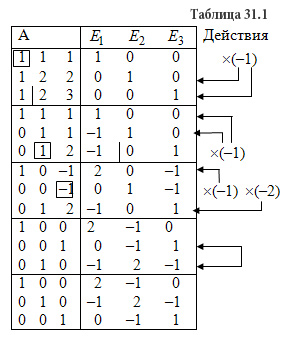 Решение: Записываем матрицу А и справа приписываем единичную матрицу Е. Используя преобразования Жордана, приводим матрицу А к единичной матрице Е. Вычисления приведены в таблице 31.1
