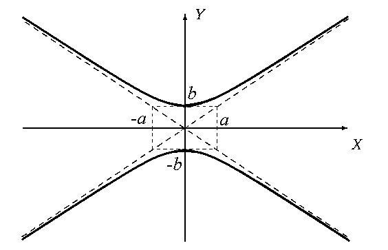 Рис.1 Прямые ay − bx = 0 и ay + bx = 0 — асимптоты гиперболы, при удалении точки гиперблы в бесконечность, соответствующая ветвь гиперболы приближается к одной из асимптот. Уравнение описывает гиперболу, вершины которой лежат на оси OY в точках (0, ± b).