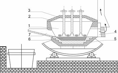 Рис.1.6. Схема электрической дуговой печи: 1 - рабочее пространство печи; 2 – съемный свод; 3 – электрод; 4 – рабочее окно; 5 - огнеупорный кирпич; 6 - жидкий металл Date: 2015-08-24; view: 2162; Нарушение авторских прав |