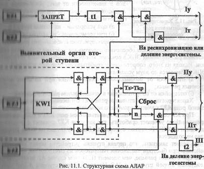 Второе условие срабатывание первой ступени определяется прохождением угла g между векторами ЭДС двух частей энергосистемы через критическое- значение. Сигнал об ЭТОМ прохождении поступает от выявительного органа второй ступени устройства на входы элементов «И» мерной ступени. Этот сигнал существует в одном ил двух видов в зависимости от того. Усеоряются ли тормозятся генераторы той части системы,где установлено усьройство а) при ускорении на выходе сигнала Iy; б) при торможении на выходе сигнала 1т. Характеристик срабатывание репе KZ2 выбирается такой, чтобы обеспечить селективное действие устройства при условии расположения ЭЦК в сечении, контролируемом данным устройством. Исходя ИЗ этого, сопротивление срабатывание реле фиксирующих ЭЦК выбирается по двум условиям. а) отстройки от минимального сопротивления при внешних асинхронных режимах; б) отстройки от сопротивления в максимальном рабочем режиме. Характеристика срабатывания реле КZ1 согласовывается с характеристикой реле KZ2 с учетом принятого времени I, При КЗ, сопровождающемся срабатыванием реле К/1 и KZ2, элемент времени tl не успевает сработать, гак как реле К/2 снимает с помощью элемента «ЗАПРЕТ» сигнал с его входи, поэтому сигнал на входе устройства не создается. Следует заметить, что первая ступень устройства может отказать в действии при быстром выпадении генераторов из синхронизма, когда реле KZ2 срабатывает раньше, чем элемент tl. В этом случае АР прекращается действием второй ступени АЛАР. Первая и вторая ступени АЛАР могуг иметь различное использование в целях ликвидации АР.
