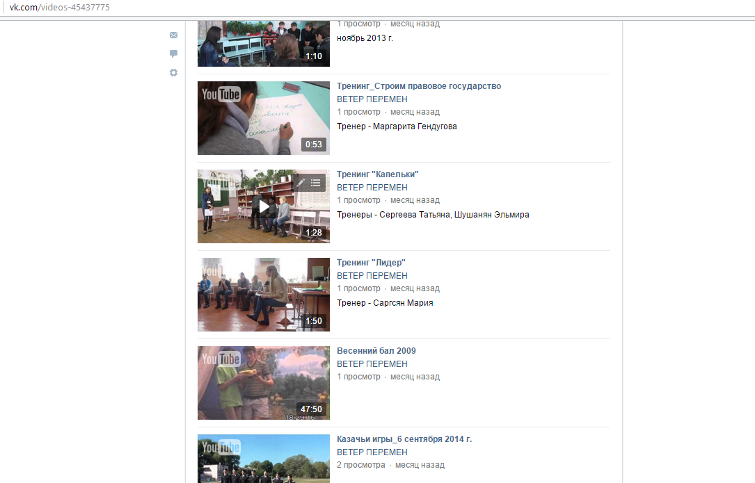 Публикация видеоматериалов детского объединения в сообществе детского объединения «Ветер перемен» в социальной сети «В контакте» http://vk.com/veter_peremen11