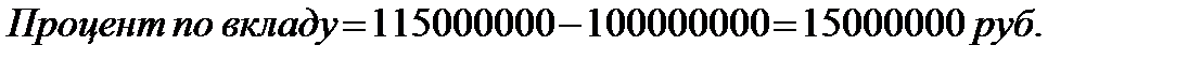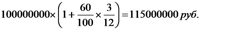 Задача 5. ООО «Лика» открывает депозитный вклад в размере 100 млн. руб. на срок три месяца с начислением процентов в конце срока действия договора из расчета 60% годовых. Требуется определить сумму денег, которую клиент получит в банке по окончании срока договора. Для решения задачи используем формулу: