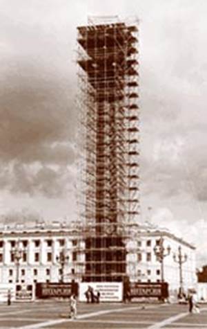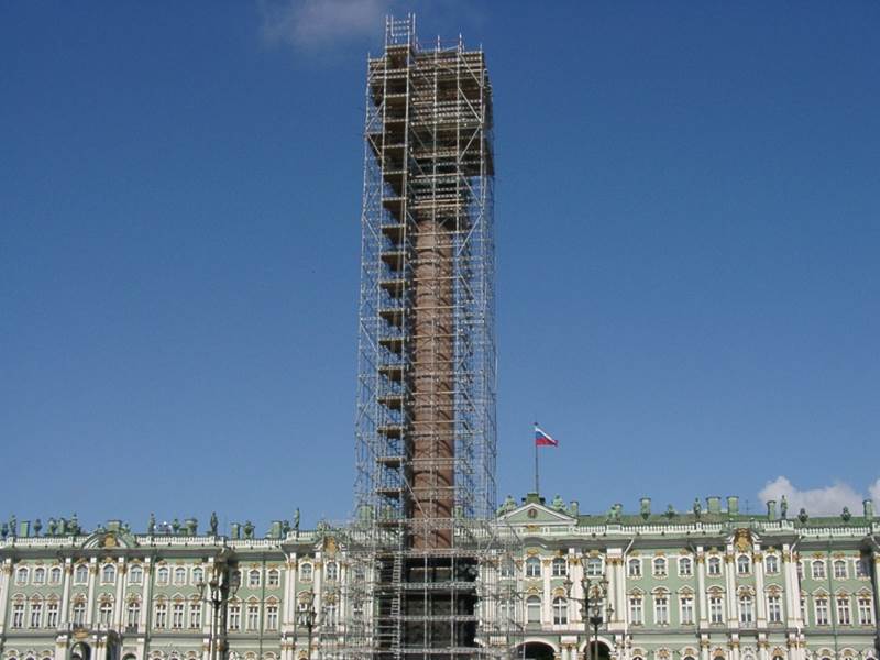 А это реставрация 2002 года. Александровская колонна в лесах, для сравнения. 07 По легенде в 1861 году была проведена реставрация колонны. Прибавляем романовские 40 лет и получаем дату реставрации колонны: 1861 + 40 = 1901 год. Декоративные фонари у колонны выполнены через 40 лет после открытия — в 1876 году архитектором К. К. Рахау. Закрепившись наверху, альпинисты выполнили фото- и видеосъёмку скульптуры. Был сделан вывод о необходимости безотлагательного проведения реставрационных работ. Реставрации были в 1901 году, в 1963 году и в 2001-2003 гг. Александровская колонна