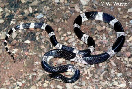 Мулга (Pseudechis australis) (Коричневый король) Яд мулги считается очень ядовитым и производится в больших количествах. За один укус средняя змея мулга может выделить 150 мг яда. Мулга встречается практически по всей территории Австралии — вся северная и большая часть западной территории материка. Их можно найти во всех штатах, за исключением Виктории и Тасмании.Местами обитания мулги являются леса, луга, пастбища, пустыни, глубоких трещинах и заброшенных норах. Они не живут в тропических лесах. Питается мулга другими рептилиями: змеями (в том числе и ядовитыми), ящерицами, лягушками, а также птицами и млекопитающими. Их организм хорошо приспособлен переваривать других ядовитых змей, их яд для мулги не опасен. Крайт (Bungarus candidus) Место обитания: Австралия, Южной Азия, острова Малайского архипелага Длина: 1,5-2 м