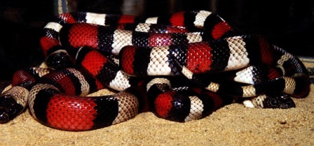 Если эфа укусит, то человек обречен, даже если он выживет, то навсегда останется калекой. В Африке от ее яда погибает больше людей, чем от всех африканских змей вместе взятых. Для эфы характерно передвижение боком. Она отбрасывает голову в сторону, затем выносит заднюю часть туловища вперед и подтягивает переднюю часть туловища. Такой способ создает лучшую опору тела на сыпучем субстрате. Из-за такого способа передвижения на песке остается характерный след — отдельные косые полоски с крючковатыми окончаниями. Эфа очень редко заползает в дома людей, но все же такое иногда случается. Подобные случаи зафиксированы в Египте. Особенно надо быть осторожными с развалинами или заброшенными домами. В 1987 году в Каире умерло трое детей, нашедших гнездо в заброшенном доме, где уже много лет никто не жил. Дети зашли в этот дом из любопытства и случайно растревожили прятавшееся там семейство эф. Змея, защищая свое только что родившееся потомство, напала на детей. Их не удалось спасти, так как яд подействовал очень быстро. Мерой первой помощи при укусе является немедленное отсасывание яда из ранок, благодаря чему значительная часть яда может быть удалена из организма. Выдавливание пальцами яда и отсасывание следует производить в течение 7-10 минут после укуса. Отсасывание совершенно безопасно для людей, которые его производят. Не следует накладывать жгут. Он практически не задерживает процесс впитывания ядов. Аспид (Micrurus) Место обитания: Австралия, север Африки, Бразилия, Аргентина, Вест - Индские острова Длина: от 60 см до 2,5 м