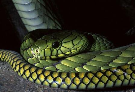 Африканский бумсланг (Dispholidus typus) Яд африканского бумсланга в 2 раза опаснее, чем яд гадюки или индийской кобры. Передние зубы на верхней челюсти имеют бороздку. Сюда стекается яд во время укуса. Сам яд отличается очень большой токсичностью. Как только попадает в кровь, тут же начинает разрушать клетки. Проводились опыты, в результате которых утки, укушенные бумслангом, погибали от яда через 15 минут, а паралич наступал уже через минуту. Яд африканского бумсланга в два раза опаснее, чем яд гадюки или индийской кобры. Известен трагический случай в 1957 году. В это время от укуса бумсланга погиб известный американский зоолог, специалист по пресмыкающимся, Карл Патерсон Шмидт, который пытался поймать африканского бумсланга и изучить его: схватил змею, а та смогла увернуться и укусить зоолога за руку. Умирая, ученый до последнего момента вел записи, в которых отмечал свое состояние. За последние 5 лет от укуса африканского бумсланга погибло 23 человека. Правда, смертей по вине гадюки в 2 раза больше, а от кобры — почти в 3 раза. С бумслангом, как и с другой любой другой змеей, надо соблюдать максимум осторожности: не подходите близко, не злите змею, не совершайте резких движений. Только по вине человека бумсланг становится агрессивным и нападает. В 9 из 10 случаев, при встрече с человеком змея просто старается скрыться. Не трогайте змею, тогда и змея не тронет вас. Зеленая мамба (Dendroaspis angusticeps) Место обитания: Южная Африка Длина: до 150 см