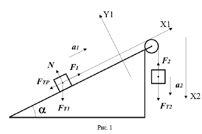 С помощью основного закона динамики можно определить силы, действующие на тело, либо характер движения (ускорение) по заданным силам. При составлении уравнения движения необходимо пользоваться следующим алгоритмом: · вначале нужно найти все силы, действующие на данную материальную точку (включая силы реакции); · затем следует найти равнодействующую этих сил; · применить основной закон динамики и решить уравнение относительно неизвестной величины. В данной лабораторной работе предлагается рассмотреть основной закон динамики на примере движения бруска массой m1 по наклонной плоскости (рис.1). Для создания силы тяги F1 а невесомую, нерастяжимую нить, перекинутую через невесомый, вращающийся с малым трением блок подвешен груз массой m2. Груз под действием силы тяжести FТ2 опускается, натягивает нить и заставляет брусок скользить равноускорено по поверхности наклонной плоскости вверх. На брусок будут действовать: сила тяжести FТ1 = m1g, сила тяги F1, сила трения FТР, сила реакции опоры N. На груз будет действовать сила натяжения нити F2 и сила тяжести FТ2 = m2g. Для описания движения бруска введем инерциальную систему отсчета, ось X1,которой сонаправлен с ускорением a 1, а ось Y1 – перпендикулярно к наклонной плоскости. Движение груза будем рассматривать относительно системы отсчета, ось X2 которой направим по направлению ускорения a2. Запишем уравнения движения бруска и груза в векторной форме: m1a1=m1g+F1+FТР+N; (2) m2a2=m2g+F2