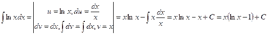 В представленном примере, как и в дальнейших, вертикальными черточками отделены вспомогательные записи. Отметим также, что в качестве v можно взять любую функцию вида x+C, где С – постоянная. Мы взяли v=x, т.е. С =0. Пример 2. Пример 3.