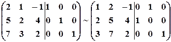 Пример 16. Методом элементарных преобразований найти обратную матрицу для матрицы: Решение. Приписываем к исходной матрице справа единичную матрицу того же порядка: 1. Поменяем местами первый и второй столбцы: