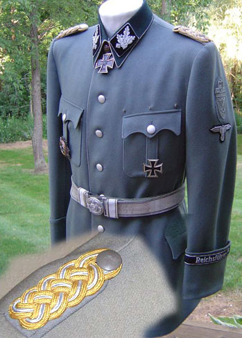 На снимке слева (реконструкция):генеральский мундир войск СС со знаками различия СС-группенфюрера. Воротник черный или очень темно-иссиня-зеленый с окантовкой из серебристого жгутика по нижнему и переднему краю. На левом рукаве эсэсовский орел, а над ним почетный щиток, такие давались за Крым, Демянск, Холм, Нарвик и т.п.). Пояс на мундире парадный, т.е. этот мундир мог носиться в различных случаях как без пояса, так и с полевой портупеей помимо парадного пояса. Заметим, что все генералы войск СС являлись членами организации Сс и могли носить как этот войсковой мундир, так и серый открытый с белой рубашкой и черным галстуком мундир общих СС. Ниже на снимке погон СС-бригадефюрера. Обратите внимание - подкладка погона светло-серая, тогда как у генералов Вермахта она была алая. Впрочем, некоторые генералы СС носили вермахтовские погоны. Генеральская фуражка СС ничем не отличалась от офицерских. Тулья светло-серого цвета, околыш черный бархатный, канты на тулье и околыше из серебристого жгутика (многие предпочитали золотистый жгутик как в Вермахте). Орел эсэсовского образца на тулье и эсэсовская эмблема "Мертвая голова" на околыше серебристого цвета. Петлицы со знаками различия генералы СС имели и на всех видах мундиров и на воротниках шинелей. Размеры петлиц одинаковые с офицерскими. Поле петлиц из черного бархата. Окантовка петлиц серебристым канатиком. Однако очень часто встречается окантовка золотистым канатиком. Погоны аналогичны погонам генералов Вермахта и представляют собой плетение из строенного сутажного шнура, внутренний ряд которого серебристый, а боковые золотистые. Плетение уложено на подложку цвета рода службы генерала. Плетение выходит за переделы подложки и закрепляется пуговицей серебристо-серого цвета. Пуговица имеет зерненую поверхность. Никаких изображений на ней нет. Знаки различия генералов СС были следующие (имея в виду, что до мая 1942 года звания СС-Оберстгруппенфюрер не существовало): 1.SS Brigadefuehrer und der Generalmaior der Waffen-SS (СС-бригадефюрер унд дер генеральмайор дер ваффен СС);