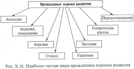 Врожденные пороки развития, возникающие после окончания основного периода органогенеза, проявляются главным образом: — остановкой в развитии — гипоплазией, — задержкой перемещения органа (например, крипторхизм), — вторичными изменениями (например, деформация конечностей при маловодий). К наиболее частым видам врожденных пороков развития относятся (рис.): — агенезия — полное врожденное отсутствие органа (например, отсутствие почки, глаза); — аплазия, гипоплазия — отсутствие или значительное уменьшение размера органа (например, одной почки, селезенки, конечности) при наличии его «сосудистой ножки» и нервов; — атрезия — полное отсутствие канала или естественного отверстия (например, атрезия наружного слухового прохода, ануса); — гетеротопия — перемещение клеток, тканей или части органа в другую ткань или орган (напр'ймер, клеток поджелудочной железы в поперечно-ободочную кишку); — персистирование — сохранение эмбриональных структур, исчезающих в норме к определенному этапу развития (например, открытый артериальный проток у годовалого ребенка); — стеноз — сужение просвета отверстия или канала (например, клапанного отверстия сердца); — удвоение (утроение) — увеличение числа органов или его части (например, удвоение матки, мочеточников). Название некоторых пороков, определяющих наличие дополнительных органов, начинается с приставки «поли-» (от греч. роlу — много). Например, полидактилия (увеличенное число пальцев); — эктопия — необычное расположение органа (например, почки в малом тазу, сердца — вне грудной клетки)