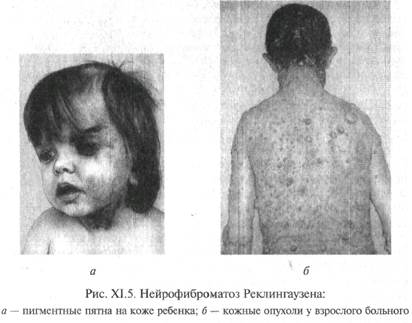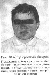 Умственная отсталость обнаруживается примерно в 3/4 случаев и может варьировать от легкой до выраженной степени. Различна и ее структура: в одной части случаев преобладают явления недоразвития с сохранением типичной для олигофренического дефекта иерархической структурой, в другой части на первый план выходят процессуальные явления деменции. Если говорить о поражениях кожи, то это прежде всего (70% случаев) ангиофиброма щек в виде «бабочки» (красные и розовые папулы), шагреневая кожа, депигментированные пятна, кофейные пятна, подкожные фиброматозные узелки и др. (рис.). В зрительной системе встречаются опухолевидные изменения сетчатки, иногда глаукома. Значительно чаще, чем в среднем в популяции, встречаются как доброкачественные, так и злокачественные опухоли различных органов. Течение заболевания прогрессирующее, большинство больных умирают в 20-25 лет.