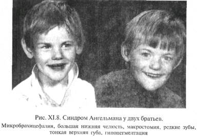 В настоящее время частота синдромажреди новорожденных оценивается примерно 1:10 000 до 1:20 000; мальчики и девочки болеют одинаково часто. Синдром Прадера-Вилли является классическим примером болезней импринтинга. Генетически синдром гетерогенен, но большая часть случаев связана с наследованием внутрихромосом-ной делеиии критического региона длинного плеча хромосомы 15(15q11-q13) отцовского происхождения. В клинических проявлениях можно выделить две фазы. Первая, ранняя фаза включает антеперинатальный период и первые два года жизни больного и характеризуется слабой подвижностью плода, низким весом при рождении (в среднем составляющим 1900 г), опасностью развития асфиксии в результате глубокой гипотонии. В неонатальном периоде отмечаются гипорефлексия, проблемы, связанные с кормлением (дети плохо сосут из-за слабости сосательного и глотательного рефлексов). Дети почти не совершают спонтанных движении, грубо отстают в развитии статических и локомоторных функций. В типичных случаях дети с синдромом Прадера-Вилли начинают держать голову не ранее чем в 6 месяцев, сидеть — после года, ходить — на 3-4-м году. По достижении 1,5-2 лет проявления мышечной гипотонии смягчаются, развивается неконтролируемая полифагия: больные постоянно испытывают чувство голода, могут есть практически непрерывно. Быстро развивается ожирение, масса тела может превышать норму в 2-2,5 раза. Жир откладывается преимущественно на туловище и проксимальных отделах конечностей. У мальчиков отмечается гипоплазия полового члена и мошонки, крипторхизм (неопущение яичек в мошонку), у девочек — гипоплазия половых губ. У большинства женщин — аменорея, в 50 % случаев — гипоплазия матки. Из признаков дисэмбриогенеза у больных наиболее часто регистрируются долихоцефалия, гилертелоризм, эпикант, миндалевидный разрез глазных щелей, «карпий» рот, высокое нёбо, гипопигментапия и аномалии дерматоглифики. Почти все больные с синдромом Прадера-Вилли — умственно отсталые, но оценки 10 могут колебаться в широком диапазоне (20-90). Часто интеллектуальные трудности представляются более выраженными, чем они есть на самом деле, из-за повышенной пресыщаемости и утомляемости. Если учитывать эти особенности при построении учебного процесса, то можно добиться значительно большего прогресса в сравнении с исходно ожидаемым. Больные, как правило, добродушны и доброжелательны, безынициативны, часты резкие немотивированные смены настроения. Особенности эмоциональной сферы в ряде случаев приводят к ошибочному диагнозу «аутизм», хотя артистические черты личности встречаются нередко. Продолжительность жизни больных в среднем составляет 25-30 лет. Дня взрослых больных на фоне умственной отсталости различной степени тяжести характерны эмоциональная неустойчивость, шперфащя, сниженная познавательная способность и моторная активность. Синдром Ангельмана выделен в самостоятельное заболевание в 1965 г. Первоначальное его название — синдром «счастливой куклы» из-за характерных клинических проявлений: приступы неконтролируемого смеха, резкие судорожные движения рук, необычная походка, хлопанье в ладоши и специфическая гримаса. Название «синдром Ангельмана» он получил в 1982 г. Его частота составляет 1:20 000 новорожденных. Как и синдром Прадера-Вилли, он представляет собой одну из болезней имприн