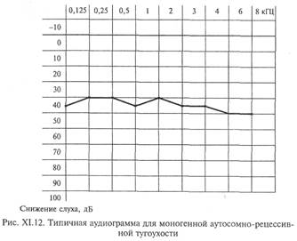 К стойким нарушениям слуха относят глухоту и тугоухость. При глухоте из-за нарушения нейросенсорных систем (кортиева органа и/или нервного аппарата слухового анализатора) восприятие звучащей речи только на слух оказывается ни при каких условиях невозможным, так как не только существенно повышен порог слухового восприятия, но ограничен и частотный диапазон воспринимаемых звуков (до 3,5-4 кГц и менее). В зависимости от тяжести поражения при таких нарушениях могут восприниматься некоторые неречевые звуки, отдельные фонемы, знакомые слова и даже фразы, но речь в целом оказывается недоступной. Тотальная глухота (когда не воспринимаются никакие звуки) составляет не более 2-3% от всех случаев этой патологии. При тугоухости восприятие речи на слух затруднено, но при специальных условиях (усиление звука) возможно, так как укорочение тон-шкалы не затрагивает речевой диапазон частот, хотя порог слухового восприятия повышен на 30-80 дБ. Следует отметить, что если в медицине иногда говорят о «временной глухоте» или «временной тугоухости», то в специальной (коррекционной) педагогике имеются в виду не преходящие, но стойкие, недоступные лечебному воздействию нарушения. Если они развиваются в детском возрасте, то это неизбежно отрицательно сказывается на речевом развитей, на формировании личности и психики в целом. Возникает состояние, включающее не только нарушение слуха, но многочисленные неврологические и психопатологические симптомы (многие из которых доступны коррекции при условии своевременной и адекватной работы). По данным отечественных авторов, около 60 % всех изолированных нарушений слуха обусловлено генетическими факторами. Наследование чаще всего носит моногенный характер, причем по аутосомно-рецессивному типу наследуется примерно 80 % случаев нейросенсорных нарушений слуха, 19% — по аутосомно-доми-нантному типу и 1% - по Х-сцепленному рецессивному типу. При значительной полиморфности аудиометрической картины в первом из упомянутых случаев типично равномерное повышение порога слухового восприятия на 45-50 дБ в пределах всего речевого диапазона частот (рис. XI.12), во втором случае аудиограмма носит нисходящий характер (в низкочастотном участке речевого диапазона слуховой порог повышен на 30-35 Дб, в высокочастотной области (3-5 кГц) — до 80 и более дБ) (рис.) и в третьем — характерно равномерное снижение до 70-80 и более дБ на протяжении всей тоншкалы (рис.). Многие сходные по клиническим проявлениям стойкие нарушения слуха генетически гетерогенны. Так, отосклероз, для которого характерно развивающееся в молодом возрасте прогрессирующее снижение слуха в связи с ограничением подвижности стремечка, сопровождающееся шумом в ушах, иногда головокружением, наследуется в большинстве случаев по аутосомно-доминантному типу с неполной пенетрантностью, однако описаны и другие типы наследования.