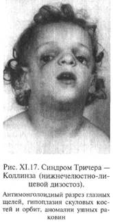 1) аномалии наружного уха. Одним из примеров данной группы нарушений является микротия с атрезией наружного слухового прохода и проводящей тугоухостью (рис.). Заболевание проявляется различными деформациями или отсутствием ушной раковины; иногда обнаруживается атрезия наружного слухового прохода; снижение слуха чаще по проводящему (кондуктивному) типу, редко — по нейросенcорному; тип наследования — предположительно аутосомно-рецессивный; 2) пороки развития и заболевания органов зрения. Примером может служить синдром Ушера, встречающийся у 2,5% глухих (врожденная нейросенсорная глухота и пигментный ретинит). Типичны врожденная нейросенсорная патология слуха, отсутствие вестибулярных реакций и медленно прогрессирующий пигментный ретинит с началом на 1-2-м десятилетии жизни. Из других глазных симлтомов наблюдаются катаракта, дегенерация сетчатки, иногда глаукома. В четверти случаев — умственная отсталость, иногда шизофрения. Наследуется аутосомно-рецессивно; 3) пороки развития скелета и болезни соединительной ткани. Среди этой группы стойких нарушений слуха можно выделить два характерньи заболевания: черепно-лицевой дизостоз, или синдром Крузона, и нижнечелюстно-лицевой дизостоз, или синдром Тричера-Коллинза. Основными проявлениями синдрома Крузона являются деформации черепа (брахицефалия, оксицефалия), экзофтальм, мелкие орбиты, гипоплазия верхней челюсти (рис.). Наблюдаются также гипертелоризм, расходящееся косоглазие, нистагм, клювовидный нос, иногда расщелина твердого нёба или язычка, двусторонняя атрезия наружного слухового прохода, различные степени снижения слуха, интеллекта, зрения. Тип наследования — аутосомно-доминантный. Основными клиническими проявлениями синдрома Тричера — Коллинза являются двусторонняя гипоплазия скуловых костей и орбит, колобома нижних век, антимонголоидный разрез глазных щелей, отсутствие ресниц на нижнем веке, аномалии ушных раковин, проводящая глухота, гипоплазия нижней челюсти (рис.). Тип наследования — аутосомно-доминантный;
