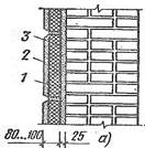 Рис. ХХ. Сплошная кладка: При многорядной системе кладки несколько уложенных с перевязкой в плоскости стены ложковых рядов перевязывают тычковым рядом (один тычковый ряд на 6 рядов кладки из одинарного кирпича или на 3 ряда из камней). При повышенных требованиях к прочности стены применяют двухрядную систему, при которой ложковые и тычковые ряды чередуются. Двухрядная система является более трудоемкой. Дополнительное повышение несущей способности каменной кладки дает её армирование горизонтальными сварными сетками, укладываемыми через 2÷5 рядов (диаметр арматуры 5÷8 мм). Этот прием используют для сильно нагруженных узких простенков в нижних этажах высотных зданий. Существенно повышает сопротивление кладки изгибу её вертикальное армирование. Устойчивость каменных наружных стен обеспечивается их пространственным взаимодействием с внутренними несущими конструкциями – стенами и перекрытиями при соблюдении определенных пропорций в размерах элементов. Для обеспечения пространственного взаимодействия наружные стены жестко связывают с внутренними стенами перевязкой кладки, а с перекрытиями – заведением последних в стены не менее чем на 100 мм, опиранием на слой раствора, соединением со стеной стальными анкерами. В многоэтажных зданиях предусматривают арматурные пояса в растворных швах под перекрытием, армопояса в уровне перекрытий. Шаг поперечных внутренних стен – диафрагм жесткости – зависит от качества кладки и конструкции перекрытия. В зданиях с перекрытиями по деревянным балкам он составляет 12 м, в зданиях с железобетонными плитными перекрытиями – 30÷40 м. Долговечность каменных стен обеспечивается применением материалов с маркой морозостойкости, соответствующей климатическому району строительства. Допустимо также применение конструктивных мер в виде облицовки наружной поверхности стены морозостойкими материалами. Сплошную кладку наружных стен в малоэтажных зданиях выполняют преимущественно из пустотелых керамических и легкобетонных камней или кирпича. При отсутствии легких материалов стены выполняют облегченной слоистой конструкции с применением полнотелого кирпича и эффективных утеплителей. На рис. ХХ показаны некоторые виды облегченных кладок. На рис. ХХ а-д показаны кладки с расположением теплоизоляционных материалов внутри стены между двумя стенками-верстами из сплошной кладки. Для обеспечения совместной работы этих стенок через определенные интервалы по высоте предусматривают горизонтальные диафрагмы, которые делают из кирпича или армированных растворных швов. В качестве теплоизоляционного слоя применяют монолитный легкий бетон, легкобетонные камни и, насыпной керамзит (только для случаев г, д). Несущая способность облегченных кладоки показанных на рис. ХХ, б –д, ж позволяет применять их в зданиях до 4-х этажей. В многоэтажных зданиях применяют конструкции, приведенные на рис. ХХ а и рис. ХХ.