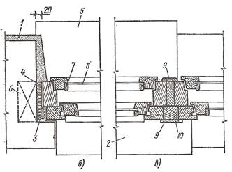 Рис. ХХ. Деревянные оконные блоки: а – с раздельными переплетами; б - со спаренными переплетами;1 – коробка; 2 - штапики; 3 – прорезь для отвода конденсата; 4 – утепляющая прокладка; 5 – наплав; 6 - внутренний переплет; 7 – наружный переплет; 8 – стяжной винт; 9 – отлив; 10 – желобок-капельник