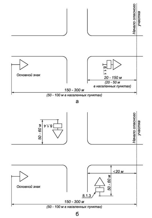 Рисунок В.2 -Установка предупреждающих знаков: а - между основным знаком и началом опасного участка имеется перекресток; б - расстояние между перекрестком и опасным участком менее 20 м
