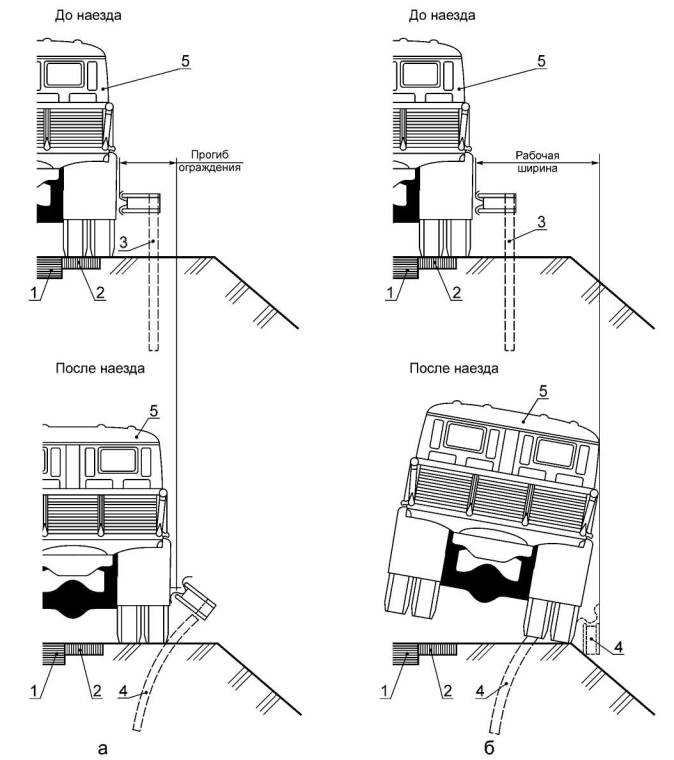 1 - проезжая часть; 2 - укрепительная полоса; 3 - недеформированное ограждение; 4 - деформированное ограждение; 5 - транспортное средство Рисунок В.25 - Динамический прогиб ограждения