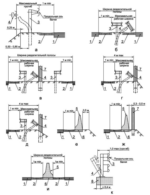 1 - проезжая часть; 2 - укрепительная полоса; 3 - недеформированное барьерное ограждение; 4 - деформированное барьерное ограждение; 5 - парапетное ограждение; 6 - основание ограждения; 7 - массивная опора; 8 - плита мостового сооружения Рисунок В.26