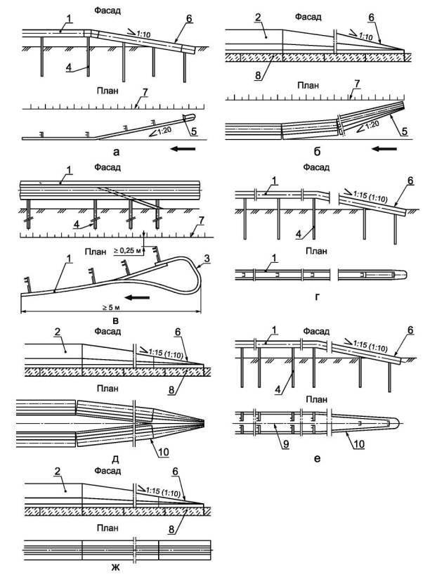 1 - барьерное ограждение; 2 - парапетное ограждение; 3 - изгиб балки ограждения; 4 - стойка ограждения; 5 - отгон ограждения; 6 - понижение ограждения на начальном и конечном участках; 7 - бровка земляного полотна; 8 - основание; 9 - ось разделительной полосы; 10 - сближение рядов ограждения с осью разделительной полосы; - направление движения транспортных средств Рисунок В.28