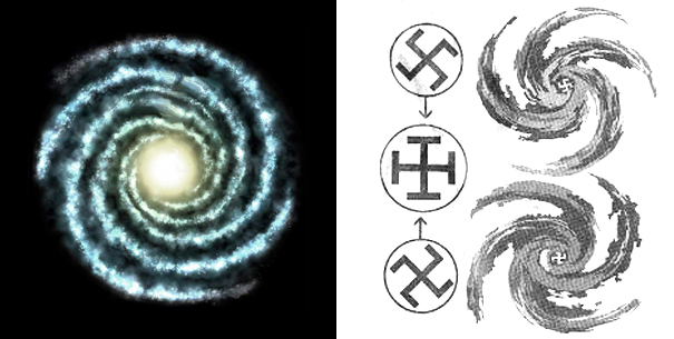 Сегодня мы поговорим о двух символах, известных нам с детства и ранней юности – свастике и знаке бесконечности. Свастика — один из самых древних орнаментов, встречающихся повсеместно — от трипольцев до третьего рейха. Причем сам символ перекочевал к нам практически в неизменном виде. По общепринятой версии, свастика — один из архаичных солярных знаков — указатель видимого движения Солнца вокруг Земли и деления года на четыре части — четыре сезона. Знак фиксирует два солнцестояния: летнее и зимнее — и годовое движение Солнца. Также это символ движения, жизни, света, благополучия. Но еще много лет назад, автор этих строк задумался: «А не слишком ли сложный это символ для определения нашей звезды? И как визуально свастика похожа на Солнце?». Позднее мои сомнения укрепились, когда я узнал, что свастика имеет два варианта визуального движения – по часовой стрелке и против часовой. Одна олицетворяет смерть, другая — жизнь. К Солнцу это точно не имело никакого отношения. Значит, возможно, эта символика чего-то более могущественного и масштабного. И главным здесь, без сомнения, является символика движения. Около года назад, просматривая фотоотчет НАСА о видах галактик, я реально обомлел. На меня смотрела огромная свастика. Точнее одна из спиральных галактик (похожая на наш Млечный путь). И все стало на свои места. Начните мысленно вращать свастику и увидите схематическое отображение галактического вихря.