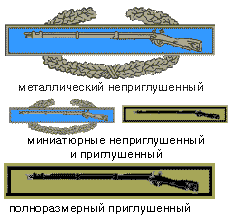 На рисунке справа полнразмерный и миниатюрный неприглушенные значки боевого пехотинца и полноразмерный и миниатюрный приглушенные значки опытного пехотинца. У приглушенного значка боевого пехотинца венок был бы черный.