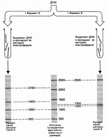 Ферменты рестрикции стали эффективным инструментом исследования. Они позволяют превращать молекулы ДНК очень большого размера в набор фрагментов длиной от нескольких сотен до нескольких тысяч оснований. С помощью метода электрофореза в агарозном геле (см. раздел 1) фрагменты ДНК, различающиеся по размеру, можно легко разделить, а затем исследовать каждый фрагмент отдельно. Сравнение размеров фрагментов ДНК, полученных после обработки определенного участка генома набором рестрицирующих нуклеаз позволяет построить рестрикционную карту, на которой указано положение каждого сайта рестрикции относительно других участков. Молекулу ДНК длиной 5000 пар нуклеотидов (п. н.). обрабатывают отдельно рестриктазами А и В. Фрагменты разделяют электрофорезом. Фермент А разрезал ДНК на 4 фрагмента размером 2100, 1400, 1000 и 500 п. н. Обработка рестриктазой В дала 3 фрагмента: 2500, 1300 и 1200 п. н. (рис. 37). Для определения расположения сайтов рестрикции этих ферментов на следующем этапе применяют процедуру двойного расщепления – обрабатывают ДНК двумя эндонуклеазами. Обработка изучаемого фрагмента одновременно двумя рестриктазами дала 6 фрагментов: 1900, 1000, 800, 600, 500, 200 п. н.