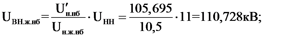 где Uн.ж – напряжение желаемое, которое необходимо поддерживать на шинах низшего напряжения в различных режимах работы сети UНН – номинальное напряжение обмотки низшего напряжения трансформатора; Для сетей с номинальным напряжением 10 кВ необходимые напряжения в режиме наибольших нагрузок и послеаварийных режимах равны 10,5 кВ, в режиме наименьших нагрузок они составляют 10 кВ По найденным расчётным напряжениям ответвлений выбираем стандартные напряжения ответвлений Тогда действительные напряжения на шинах низшего напряжения подстанции могут быть найдены по формулам: