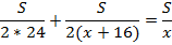 Составляем уравнение: ( Ответ: 4 ч. Тренировочные задачи: 1. Из городов А и В, расстояние между которыми равно 330 км, навстречу друг другу одновременно выехали два автомобиля и встретились через 3 часа на расстоянии 180 км от города В. Найдите скорость автомобиля, выехавшего из города А. Ответ дайте в км/ч. (50) 2. Расстояние между городами А и В равно 435 км. Из города А в город В со скоростью 60 км/ч выехал первый автомобиль, а через час после этого навстречу ему из города В выехал со скоростью 65 км/ч второй автомобиль. На каком расстоянии от города А автомобили встретятся? Ответ дайте в километрах. (240) 3. Расстояние между городами А и В равно 470 км. Из города А в город В выехал первый автомобиль, а через 3 часа после этого навстречу ему из города В выехал со скоростью 60 км/ч второй автомобиль. Найдите скорость первого автомобиля, если автомобили встретились на расстоянии 350 км от города А. Ответ дайте в км/ч. (70) 4. Два человека отправляются из одного и того же места на прогулку до опушки леса, находящейся в 4,4 км от места отправления. Один идёт со скоростью 2,5 км/ч, а другой — со скоростью 3 км/ч. Дойдя до опушки, второй с той же скоростью возвращается обратно. На каком расстоянии от точки отправления произойдёт их встреча? (4) 5. Из городов A и B навстречу друг другу выехали мотоциклист и велосипедист. Мотоциклист приехал в B на 4 часа раньше, чем велосипедист приехал в A, а встретились они через 50 минут после выезда. Сколько часов затратил на путь из B в A велосипедист? (5) При решении задач на движение в противоположных направлениях полезно использовать понятие «скорость удаления», которая находится сложением скоростей движущихся объектов. Как связаны между собой расстояние, скорость и время при движении тел в противоположных направлениях? Такой же точно формулой, что и при движении навстречу: S = (v1 + v2) t, где S – расстояние между объектами после их удаления друг от друга; v1 + v2 – скорость удаления объектов; t – время движения. Задача: «Из деревни Простоквашино одновременно оправились на поиски пропавшей коровы Мурки кот Матроскин и пес Шарик. Один из них побежал в южном направлении, другой – в северном. Через полчаса расстояние между ними стало равным 16 км, причем Шарик пробежал на 6 км больше, чем Матроскин. С какой скоростью бежал каждый из них?» 1) 16: 2) 16 – 6 = 10 (км) – удвоенное расстояние, которое пробежал Матроскин; 3) 10 / 2 = 5 (км) – расстояние, которое пробежал Матроскин за 30 мин; 4) 5*2 = 10 (км/ч) – скорость Матроскина; 5) 32 – 10 = 22 (км/ч) – скорость Шарика. Ответ: 10 км/ч; 22 км/ч. Тренировочные задачи: 1. Из одного пункта в противоположных направлениях вышли два пешехода. Скорость одного из них 6 км/час, и он был в пути на 2 час больше, чем другой. Скорость другого составляла 2/3 скорости первого. Сколько времени был в пути каждый пешеход, если они удалились друг от друга на 28км? 2. Папа и сын плывут на лодке против течения. В какой-то момент сын уронил за борт папину шляпу. Только через 15 мин. Папа заметил пропажу, быстро развернул лодку, и они поплыли по течению с той же собственной скоростью. За сколько минут они догонят шляпу? (15) · Задачи на движение в одном направлении. В задачах на движение в одном направлении при одновременном начале движения объектов полезно использовать понятия «скорость сближения» и «скорость удаления», которые находятся вычитанием меньшей скорости из большей. Ра