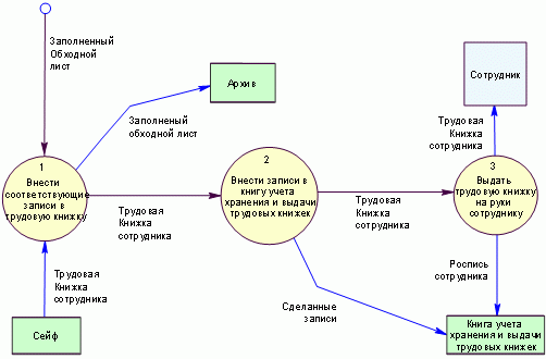 Рис. 3. DFD-схема бизнес-процесса "Оформлении и выдача трудовой книжки сотруднику при увольнении" в нотации Гейна-Сарсона. На данной схеме в качестве хранилища данных выступают сейф, в котором хранятся трудовые книжки и архив, в который помещается заполненный обходной лист. В качестве внешней сущности выступает сотрудник, который увольняется и который получает выход рассматриваемого бизнес-процесса – трудовую книжку. Вторая нотация Йордона-Де Марко методологии DFD была названа в честь разработавшего ее специалиста Йордона-Де Марко. В первом приближении эта нотация аналогична нотации Гейна Саросна, за исключение форм объектов: для описаний операций бизнес-процесса вместо закругленных прямоугольников стали использоваться круги, немного видоизменились и другие объекты – хранилище данных и внешние сущности (рис. 4).