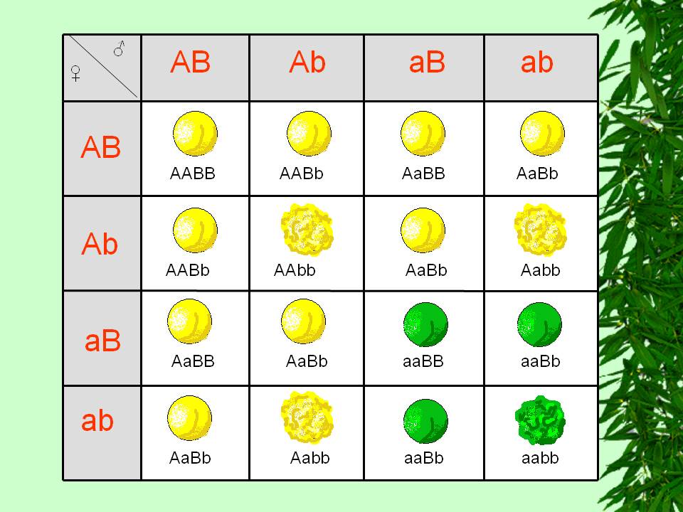 *Розщеплення в F2: 9 – жовте гладеньке (світло сірі клітинки); 3 – жовте зморшкувате (білі клітинки); 3 – зелене гладеньке (темно сірі клітинки); 1 – зелене зморшкувате (чорні клітинки). *Розщеплення в F2 на чотири фенотипи обумовлене рекомбінацією (від лат ре – повтор, поновлення, комбінатіо – поєднання) – перерозподіл спадкового матеріалу батьків у генотипі нащадків (нові поєднання алелей різних генів у гаметах гібридів, які відрізняються від їхнього поєднання у гаметах батьків).