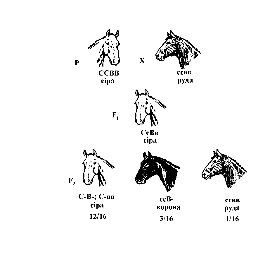 (b+ – сіре тіло; b – чорне тіло;vg+ – нормальні крила; vg – короткі крила)