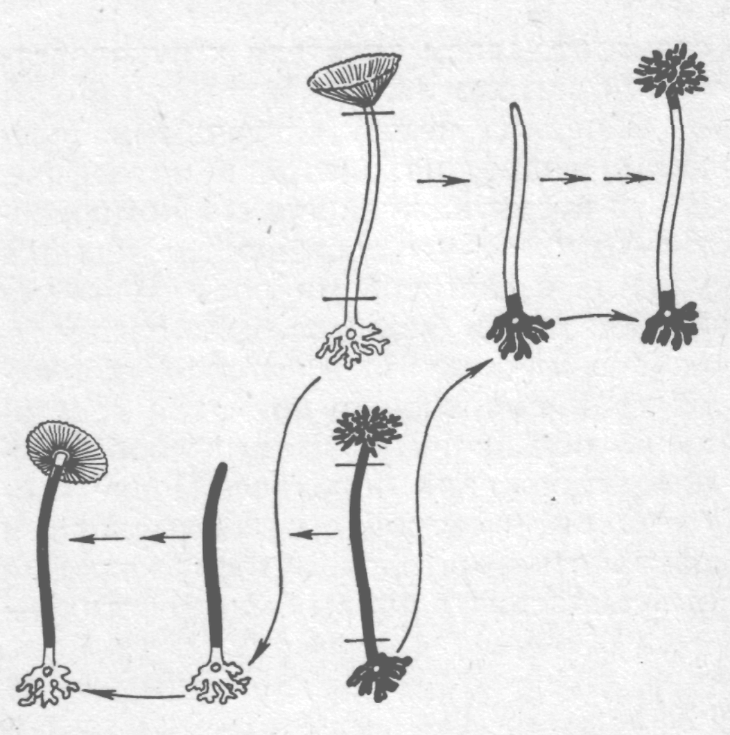 | Форма шапочки дуже різна в різних видів ацетабулярій. Якщо зрощувати відрізане стебельце одного виду з ризоїдом іншого, то шапочка, яка регенерує на стебельці має форму, властиву виду, якому належить ядро.