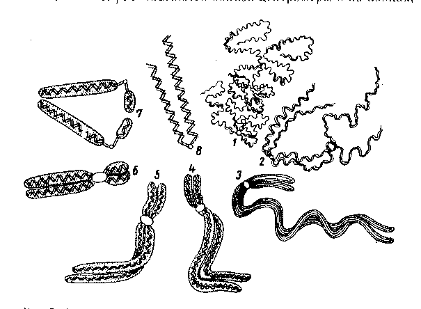 1 – інтерфаза, хромономи слабоспіралізонані; 2, 3, 4 – профаза, посилення спіралізації хромонем, утворення двох хроматид; 5 – прометафаза, поява чотирьох напів хроматид; 6 – метафаза, максимальна спіралізація, помітні велика і мала спіраль; 7 – анафаза; 8 – телофаза (одна з дочірніх хромосом), де спіралізація хромонем