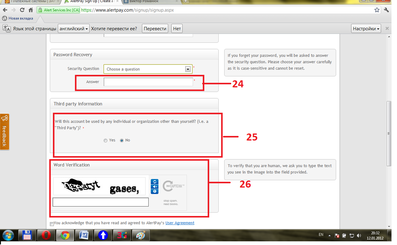Пункт 24 – отвечаем на поставленный контрольный вопрос. Пункт 25 – отвечаем на поставленный вопрос, будет ли еще кто-нибудь пользоваться электронным кошельком, кроме вас, отвечаем нет. Пункт 26 – вводим код с картинки.