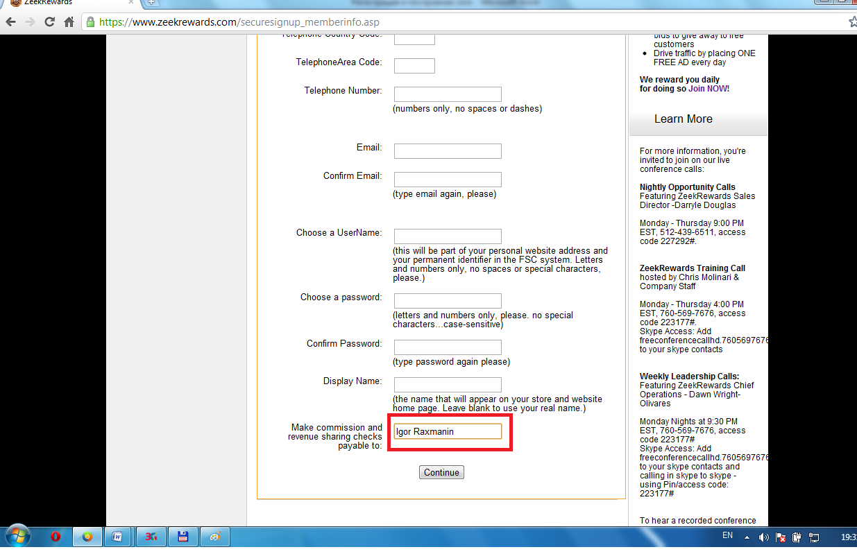 Пункт 17 - заполняем графу Email (адрес электронной почты с gmail.com) например - bussines_1212@gmail.com.Не забудь указать в адресе @gmail.com Пункт 18 - заполняем графу Confirm Email – повторяем свои Email путем копирования с пункта 17. Пункт 19 - заполняем графу Choose a UserName (Логин,под которым будет осуществляться вход на сайт - http://zeekrewards.com/) – например Igor1234,но должен содержать буквы и цифры, я бы рекомендовал тебе записать его в ежедневник, что бы не забыть. Пункт 20 - заполняем графу Choose a password (пароль) - например 2398yfud,пароль должен быть сложным и состоять из цифр и букв, я бы рекомендовал тебе записать его в ежедневник, что бы не забыть. Пункт 21- заполняем графу Confirm Password (повторяем пароль) Пункт 22- заполняем графу Make commission and revenue sharing checks payable to (Фамилия и имя пользвателя) – например Igor Raxmanin (вводим через пробел)