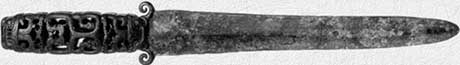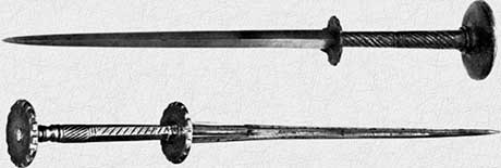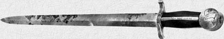 Вероятно, на этом можно было бы закрыть тему, однако следует упомянуть значительный ассортимент рукоятей, являющихся переходными от чисто металлических к таким, в которых металл присутствует в качестве более или менее обширных колец, полос, накладок или обмоток поверх какойнибудь прочной основы, в качестве каковой чаще всего использовалось дерево твердых пород. Здесь помимо чисто утилитарных моментов вступает в силу новый фактор — художественный. Металлические элементы скрепляли конструкцию и декорировались в соответствии с пожеланиями заказчика и стоимостью изделия в целом. Рукоятка большого охотничьего кинжала XV века дает нам образец подобной работы.