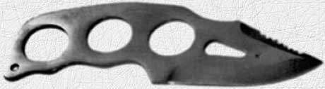 Как правило, рукояти такого типа не стальные, а сделаны из легкого, но прочного сплава, алюминиевого или титанового. Вопрос прочности отнюдь не маловажен, так как имеется чрезвычайно нагруженная и проблематичная зона соединения клинка и рукоятки, поскольку в данном случае мы не имеем длинного хвостовика, распределяющего усилие по всей ее длине. Попросту говоря, если вам придет в голову сделать подобную рукоять из, скажем, силумина, то почти наверняка она вскоре разрушится где-нибудь в районе заклепки.