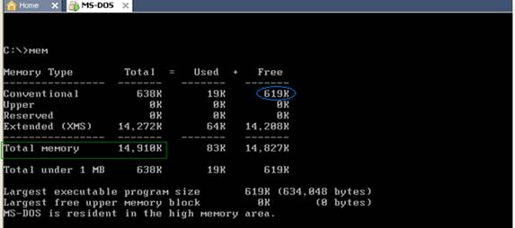 Объем свободной стандартной памяти (Conventional)=619К, как видно на данном изображении.