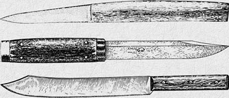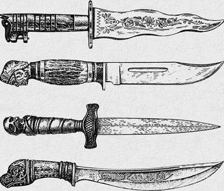 Собственно говоря, аналогичными рукоятками комплектуется изрядное число колющих предметов, в особенности всевозможных кортиков. Правда, их рукоятки обычно изящнее и тоньше (о кортиках поговорим отдельно). Абсолютное большинство охотничьих и боевых ножей имеют выпуклые двусторонние и односторонние рукоятки. В последнем случае о них говорят: «с брюшком». Форма сечения может быть круглой или овальной.