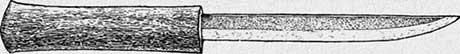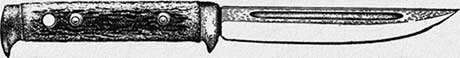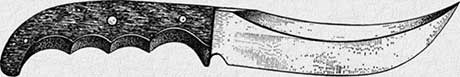 В рукоятках подобного типа отсутствует как таковая головка, или навершие, потому что добавлять его попросту некуда. Когда бы не наличие развитых гард или ступеньки при переходе тонкой шейки рукояти в широкий клинок, как у показанного выше печака, то рука постоянно соскальзывала бы к лезвию со всеми неприятными последствиями. Оттого конусный стиль не может быть признан таким уж удобным, особенно для современных охотничьих и боевых ножей. Вогнутые рукоятки соединяют в себе положительные качества того и другого конусов, врастая в ладонь, будто родные. Однако разная глубина вогнутости заметно влияет на сферу применения стиля и, говоря научным языком, эксплуатационные характеристики. Слишком малая «приталенность» сближает такую рукоять с прямыми тем сильнее, чем она мельче. Этой формой наделены некоторые японские рукоятки, а также изделия Востока, хотя там всегда стремились к более, скажем так, пышным очертаниям. Подобный тип ножа характерен также для старой Руси, которая традиционно пила и пьет культурные соки отнюдь не засушенного Запада, и для народов Крайнего Севера. Вот ненецкий нож: