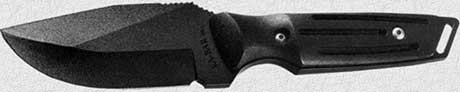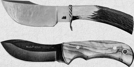 Очень важным фактором, особенно в пешем путешествии, где нож является частью аварийного запаса, является его вес. Нынешние походы и охоты редко протекает в значительном отрыве от благ цивилизации, и потому вес перестает быть жестким лимитирующим фактором. Специфика охотничьих приключений издавна вызвала к жизни понятие «ножевой гарнитур», т. е. наличие у охотника двух-трех ножей для различных целей: во-первых, нож для ошкуривания и разделки туши, во-вторых — нож для хозяйственных и лагерных работ, в-третьих — нож для добивания крупного зверя. Упомянут этот нож только на третьем месте по той причине, что в ХХ веке он практически вышел из употребления с появлением многозарядных охотничьих ружей, когда добить зверя удобней и безопасней повторным выстрелом. Однако сейчас, в связи с возрождением шомпольных ружей для «экологической» и «природосберегающей» охот, интерес к ним снова растет, и подобные образцы то и дело попадаются в каталогах фирм. Такие ножи (чаще — кинжалы) имеют прочные клинки длиной 30 и более сантиметров, выраженное острие и рукоять с упором для облегчения колющего удара. Ножи для общехозяйственных и лагерных работ полностью подпадают под требования, сформулированные выше. Ими же можно пользоваться для рубки при разделке туши. Весьма специфическим является нож для ошкуривания и разделки, утилитарно соответствующий главному назначению ножа: резать. Колоть, рубить, вскрывать консервные банки можно другими инструментами, а нож должен вспарывать шкуру кабана, лося, медведя, производить ее обдирку и зачистку, не оставляя после себя ни сала, ни мяса. Затем он должен резать брюшину, диафрагму, горловые хрящи, потом производить разделку туши и ее обвалку (срезание мяса с костей). Все это отлично выполняет простой нож с лезвием 12–14 см и шириной 20–30 мм, с теплой деревянной ручкой длиной те же 12–14 см. Его рабочей частью является закругленный конец, гарантирующий от случайного прокола ценной шкуры. Исстари повелось, что универсальным охотничьим считается нож, у которого острие расположено выше обуха, а изгиб лезвия при достаточно длинном прямом клинке довольно крутой. Рабочая часть приходится на загиб лезвия и его небольшую прямую часть, центр тяжести должен приходиться на «пятку» (часть клинка, расположенную непосредственно перед рукоятью) или быть незначительно выдвинут вперед. При этом почему-то распространилось мнение, что подобная конструкция не может быть эффективно использована в боевых целях, т. е. против человека. Да неужели? В боевых целях можно использовать и алюминиевую вилку. Однако такая позиция лицензирующих органов облегчала сертификацию продукции. Своеобразным охотничьим ножом является так называемый скиннер (от английского skin — шкура), предназначенный только для снятия и первичной обработки шкуры (выскабливания). Положение острия относительно спинки, определяющее форму клинка вдоль центральной оси, может быть различным.