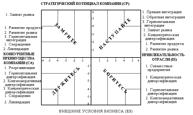 Рис. 11. Матрица SPACE Таблица 3.12 Уточненные стратегии, предлагаемые компанией Артур Д. Литлл